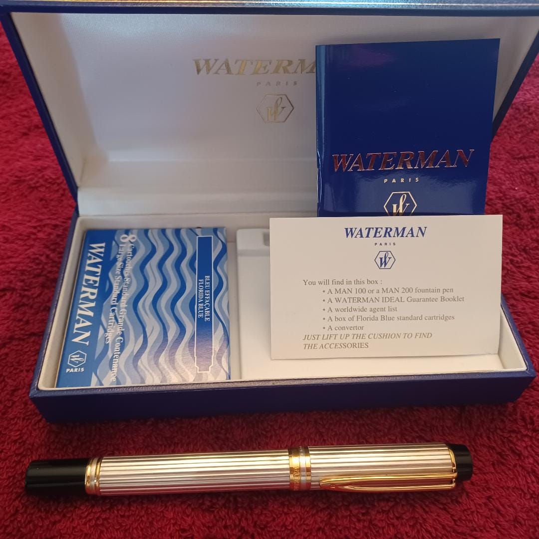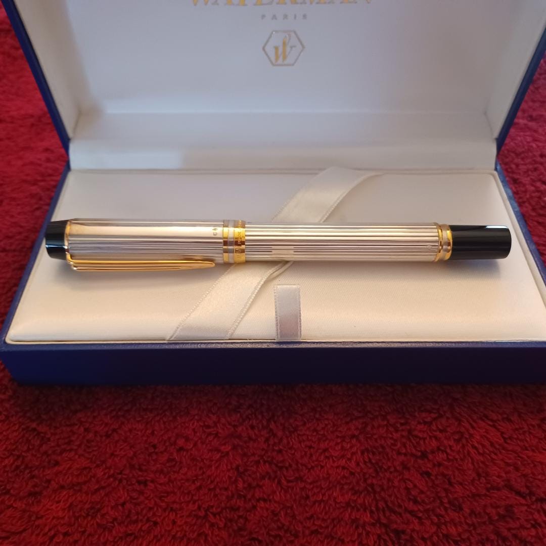 Pen was purchased new from Joon Pens in New York City November 11, 2007 and never used it-note the included original ink cartridges ( blue) still in pristine condition. Other than a Waterman museum piece this may be the only one in such condition still available anywhere. If any executive or professional wants to make a statement when signing an important document this will do it. Actually, just uncapping the pen will say something even before its owner says a word. I am a retired CPA international auditor and purchased the pen solely as an investment