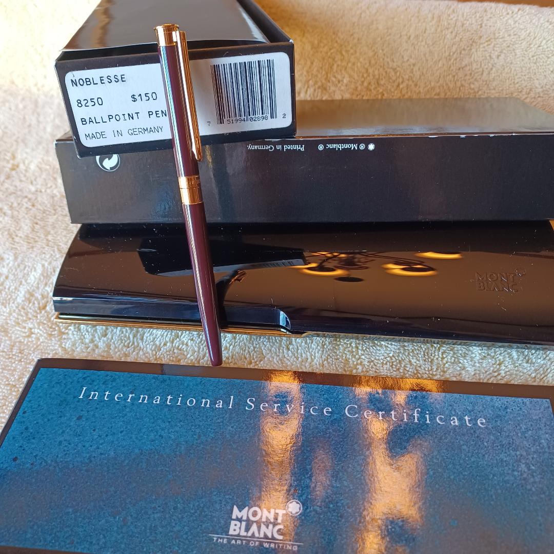 Montblanc Noblesse unused ball pen with a beautiful pristine lacquer finish. Complete with all inner and outer packaging and Montblanc brochure. The only handling of this pen and packaging was when it was purchased and then 40 years later preparing it for sale